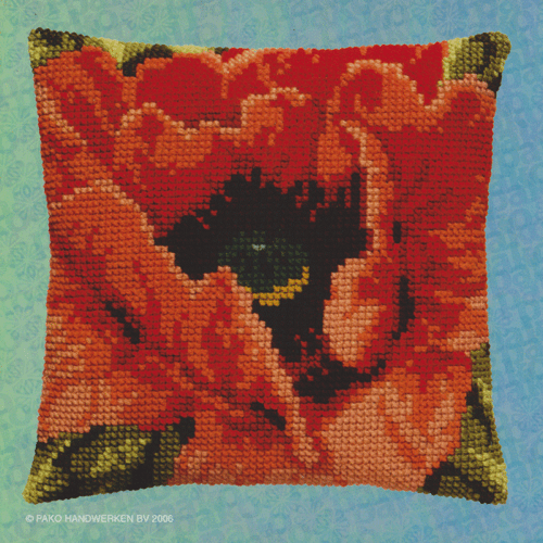 Valmue - pude som broderes på påtrykt/påmalet  groft stramaj  1,8 og der broderes med acrylgarn. Størrelse 40 x 40 cm.