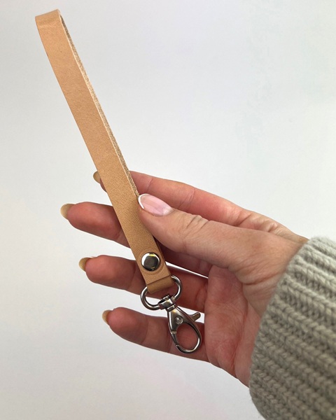Lys læderrem til en garnholder to go. Størrelse 1 cm bred og 19 cm lang incl. krog. Garnholderen kan du se og evt. her