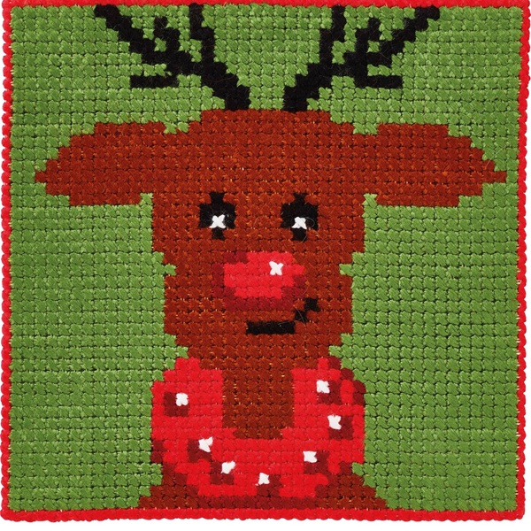 Rudolf - børnestramaj med mønsteret trykt på stoffet. Der broderes korrsting med acrylgarn. Størrelse 25 x 25 cm. Broderipakningen indeholder stramajstof med påtrykt mønster, broderigarn og nål.