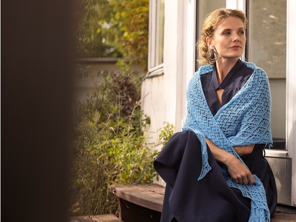 Ocean Swell - opskrift og garn til et smukt sjal som strikkes i Saga garn 100 % uld fra Filcolana. Design Karen Skriver Lauger.
