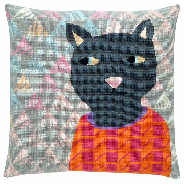 Kat - stramajpude med broderi designet af Astrid Skibsted Holm for Fru Zippe. Puden broderes på stramaj 4,4 med flora wool. Størrelse 38 x 38 cm.