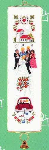 Bryllup 3  - klokkestreng med broderi fra Eva Rosenstand. Broderes på 12-trådet hørlærred med amagergarn. Størrelse 10 x 40 cm. Broderipakningen indeholder broderistof, mønster, nål og beslag (dog ikke klokke).