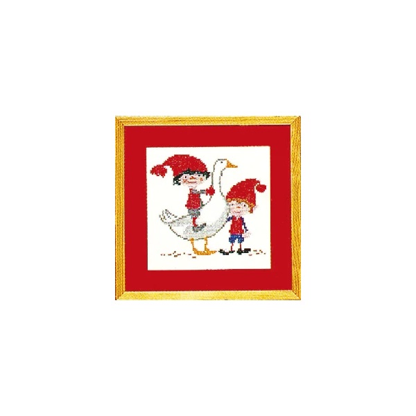 Nisser med gås -  juleophæng med broderi designet af Mads Stage for Haandarbejdets Fremme. Ophænget broderes på 10-trådet hørlærred med Dansk Blomstergarn.