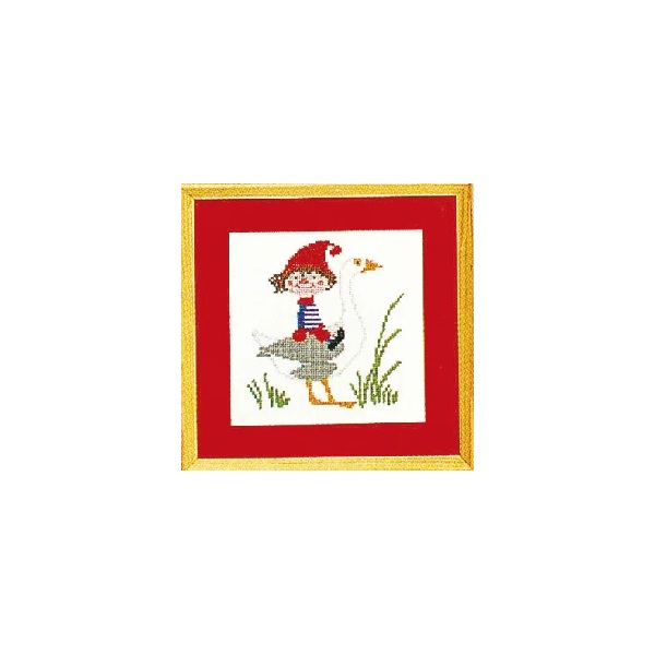 Lille juleophæng med nissedreng på gås designet af Mads Stage for Haandarbejdets Fremme. Ophænget broderes på hørlærred med Dansk Blomstergarn.