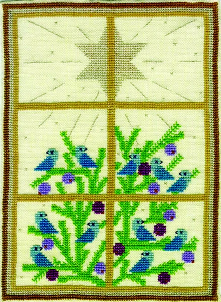 Vinterfugle - fint lille ophæng i blåt og sølv designet af Edith Hansen for Haandarbejdets Fremme. Ophænget broderes på 12-trådet hørlærred med Dansk Blomstergarn. Størrelse 15,5 x 20,5 cm.