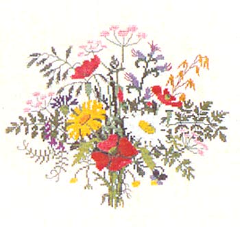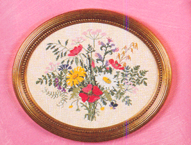 Dronningens buket -  smukt ophæng med broderi designet af Gerda Bengtsson for Haandarbejdets Fremme . Ophænget broderes på 10-trådet hørlærred med Dansk Blomstergarn. Størrelse 24 x 30 cm. Broderipakningen indeholder hørlærred, broderigarn, mønster og nål.