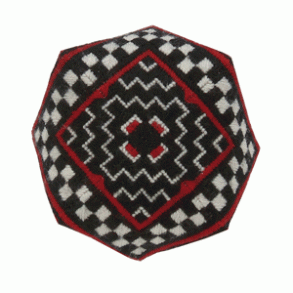Blomsterkrans på sort baggrund - nålepude med broderi designet af Birthe Larsen. Nålepuden broderes med hørtråd på stramaj med 4 sting pr. cm. Størrelse ca. 10 x 10 cm.