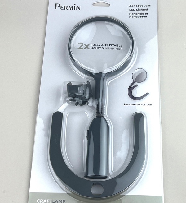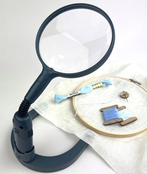 Bordlup med lys - justerbar med stabil fod, perfekt til broderi, strik, læsning m.v. Lampen bruger 2 AA batterier (medfølger ikke).